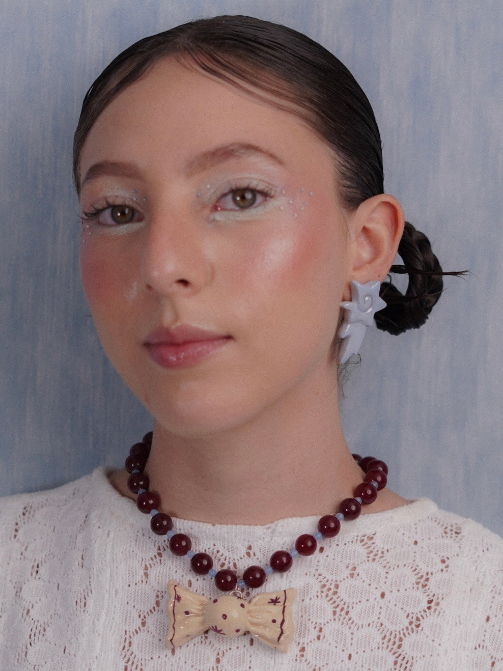 Un recuerdo a nuestra colección “La Dulcería”. Nuevo collar de caramelo con print de estrellas. Perlas de ágata natural burgundy, perlas ojo de gato azul y herrajes en plata 925. Dije principal creado y pintado a mano en cerámica artesanal.