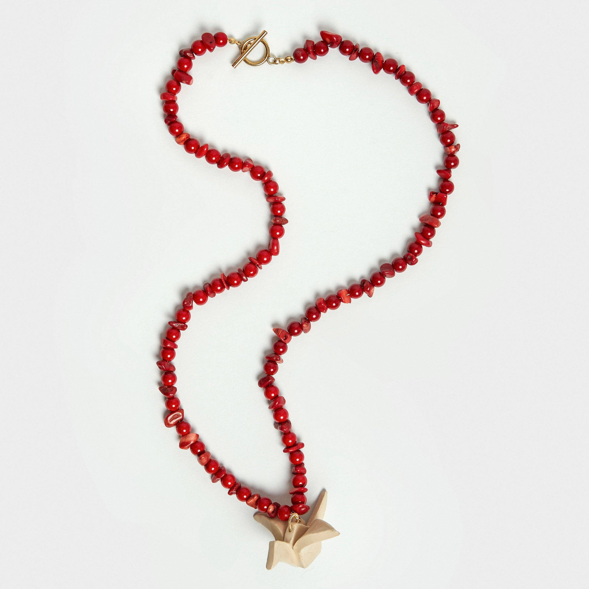 Nuevo collar tipo de péndulo creado en piedra picada y perla acrílica roja. Dije de gruya de papel creada y pintado a mano en cerámica artesanal.